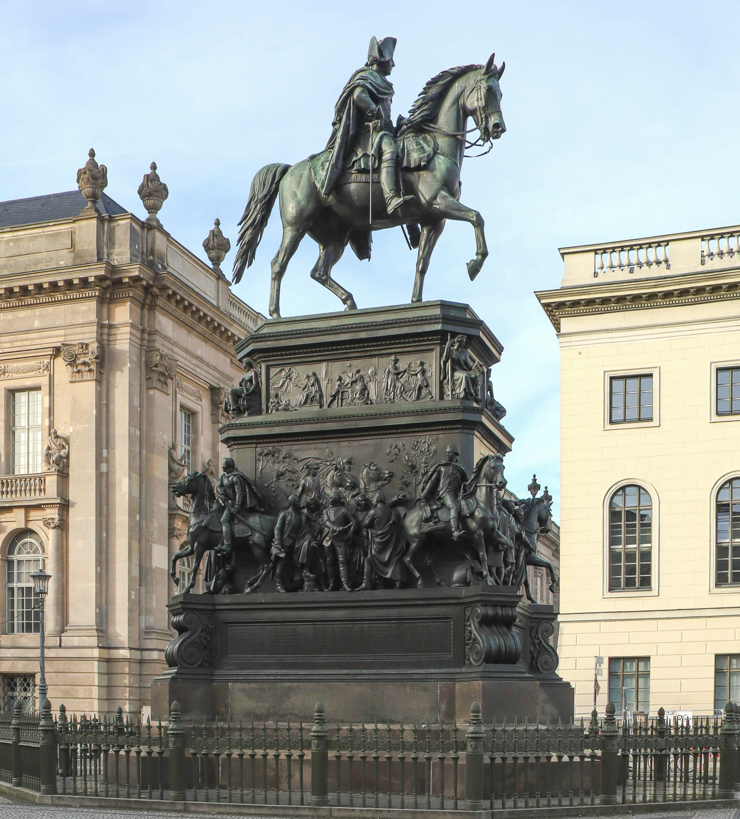 Das Reiterstandbild im Park Sanssouci ist wesentlich einfacher gehalten. Der Sockel ist im Unterschied zum Original in Berlin sehr schlicht. Auf die Ausschmückung mit Szenen aus Friedrichs Leben sowie bedeutenden Militärpersonen, Politiker, Künstler und Wissenschaftler aus Friedrichs Zeit wurde hier verzichtet.